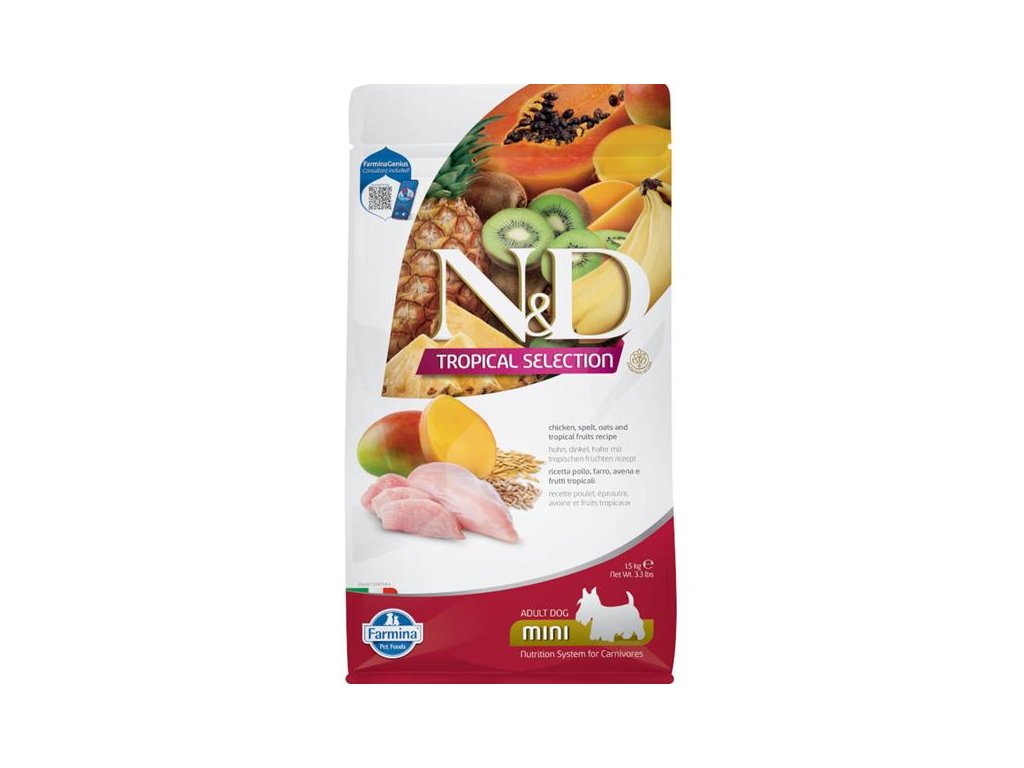 Řada N&D Tropical Selection v sobě kombinuje kvalitní zdroje živočišných bílkovin, vysoce kvalitní obiloviny a chutné tropické ovoce pro nasycení vašeho zvířecího kamaráda.