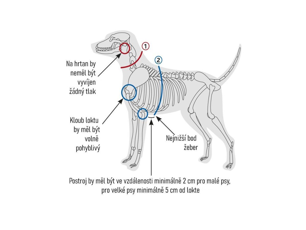 Popruhy na krku a hrudníku jsou plynule nastavitelné, což umožňuje přesné přizpůsobení postroje tělu psa.
