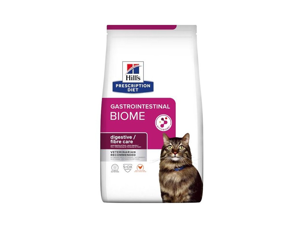 Pokrokové krmivo, které podporuje zdraví střev. Kompletní krmivo pro dospělé kočky je připravené z chutného kuřete a dalších snadno stravitelných surovin včetně rýže a kukuřice. Vyrábí se pomocí speciálně vyvinuté technologie ActivBiome+ a obsahuje speciální vlákninovou směs, která přispívá ke zdraví mikrobiomu ve střevě a podporuje pravidelné vyprazdňování. Krmivo pro kočky Hill's Prescription Diet Gastrointestinal Biome je bohaté na omega-3 mastné kyseliny a vyniká svou stravitelnou recepturou. Je zároveň chutné, a proto ho mnoho koček dobře přijímá.